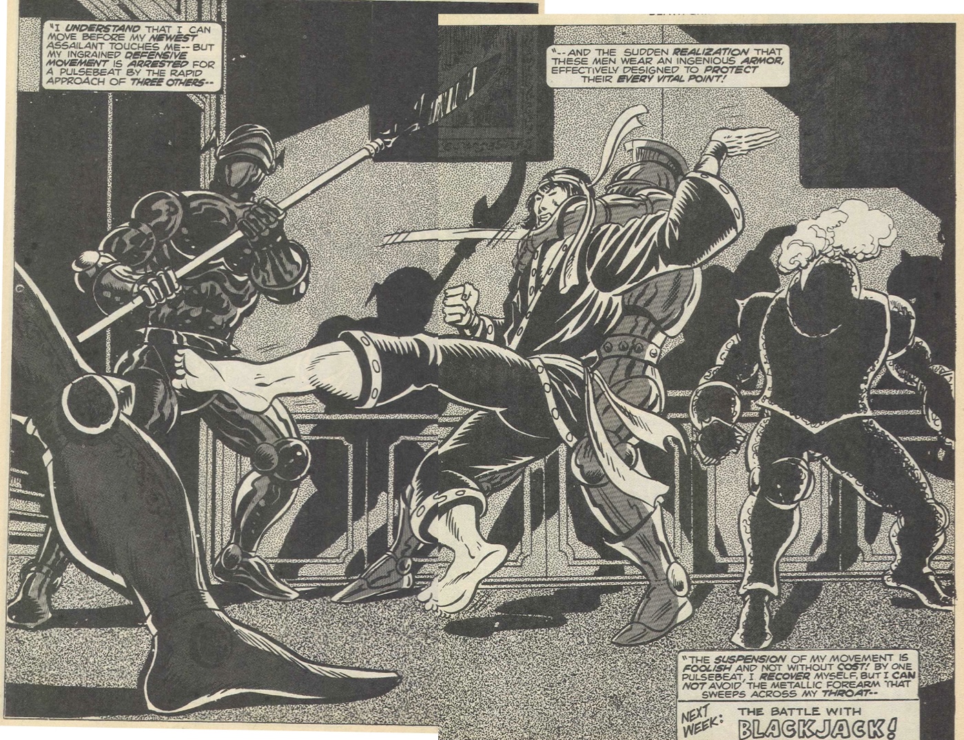 After entering the "Murder Mansion" steel shutters close off the windows and doors, followed by a group of federal agents sent in to tackle the intruder with no success Shang-Chi easily over-powers them. Then a series of traps are set to kill the kung fu fighter, but Shang-Chi skilfully navigates his way past them all. Until he enters a room with multiple suits of armour that spring a deadly attack. This double page must have been printed on adjoining pages of the US issue but in the UK version they are shown on back to back pages, giving the impression of a knight attacking a leg on one page and two more grabbing Shang-Chi on the next. I've tried to match the two together as it should be seen but the print sizes aren't perfect, but oh well. Next week, if he escapes that death grip, Shang-Chi must battle Black Jack! "Osu!"